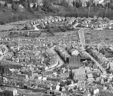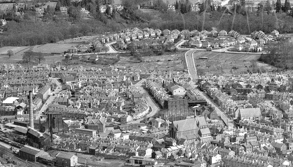 A wonderful aerial photograph, taken in April 1953, of the Ferndale Park Estate in the distance behind the Charity Farm and Hilbert allotments each side of Pigs Hill (King George V Hill), with the large houses in Ferndale behind it, taken before the second phase of building in the gaps left by the pre-war building. Note the number 83 bus at the top of Pigs Hill in Hilbert Road where it used to turn round ready to drive back to town, leaving the estate every 15 minutes (on the hour, quarter-past, half-past and quarter-to the hour), and always on time. What a wonderful service that was compared with modern day bus services. St James’ School is in the front centre and the tall chimney stack of the power station in Quarry Road left centre. Note the general absence of cars on the roads – photo thanks Mick White, Facebook OTWPS