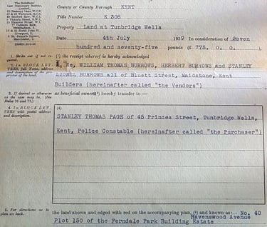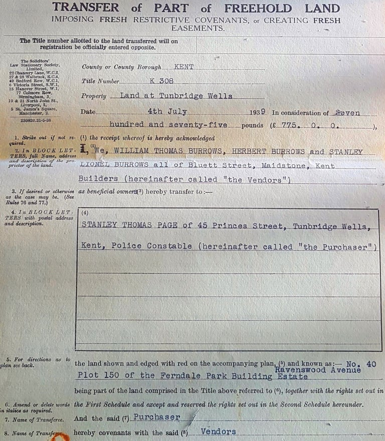 The transfer document (above left) when my dad, Stanley Thomas (Nick) Page, purchased 40 Ravenswood Avenue on 4 July 1939, and the plan– images thanks Gillian Page.