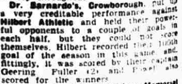 The following week, the 29 January 1960 Courier reported, ‘In Minor League games...Dr Barnado’s, Crowborough put up a very creditable performance against Hilbert Athletic and held their powerful opponents to a couple of goals in each half, but they could not score themselves. Hilbert recorded their 100th goal of the season in this game and fittingly, it was scored by their captain Geering. Fuller (2) and Powel also scored for the winners.’