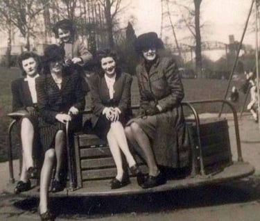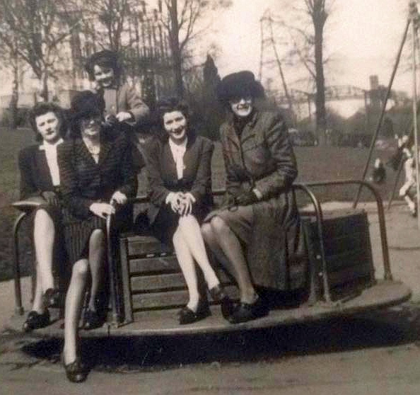The roundabout in the rec in 1947, posted by Nigel Malyon (who used to live in Burslem Road) on Facebook OTWPS, showing his mother and four sisters (l to r) Pauline, Betty, Marg, Dawn (mother) and Ruth. The edge of the swings can just be seen on the right of the picture – photo thanks Nigel Malyon, Facebook OTWPS.